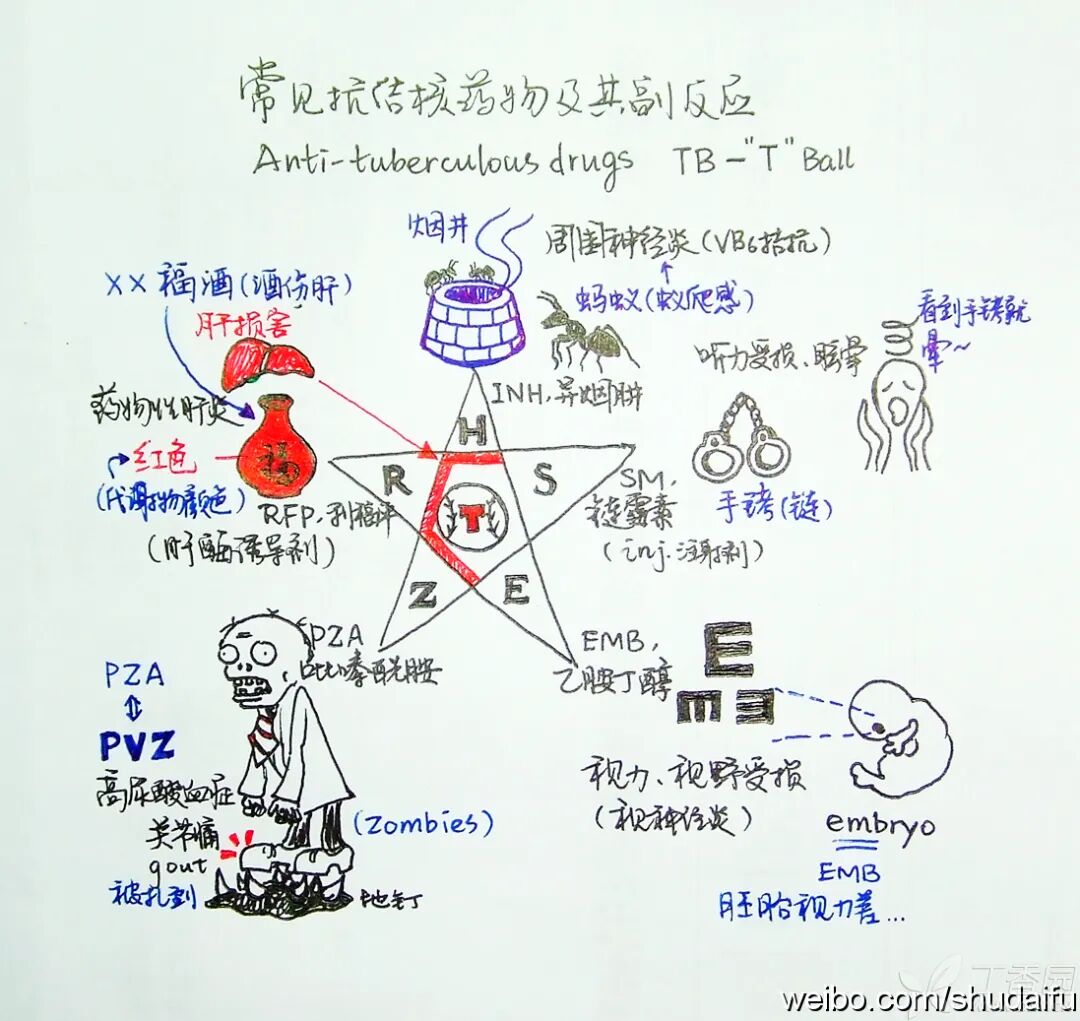 这些东西晦涩难以记忆,以前虎虎本科学药理学时,就记不住这些东西。如今工作开始面对众多脊柱结核患者,又开始留意这些问题。回想这些问题时,突然想起考研时期看到北京协和医院皮肤科舒畅博士画的一幅有趣的图画: