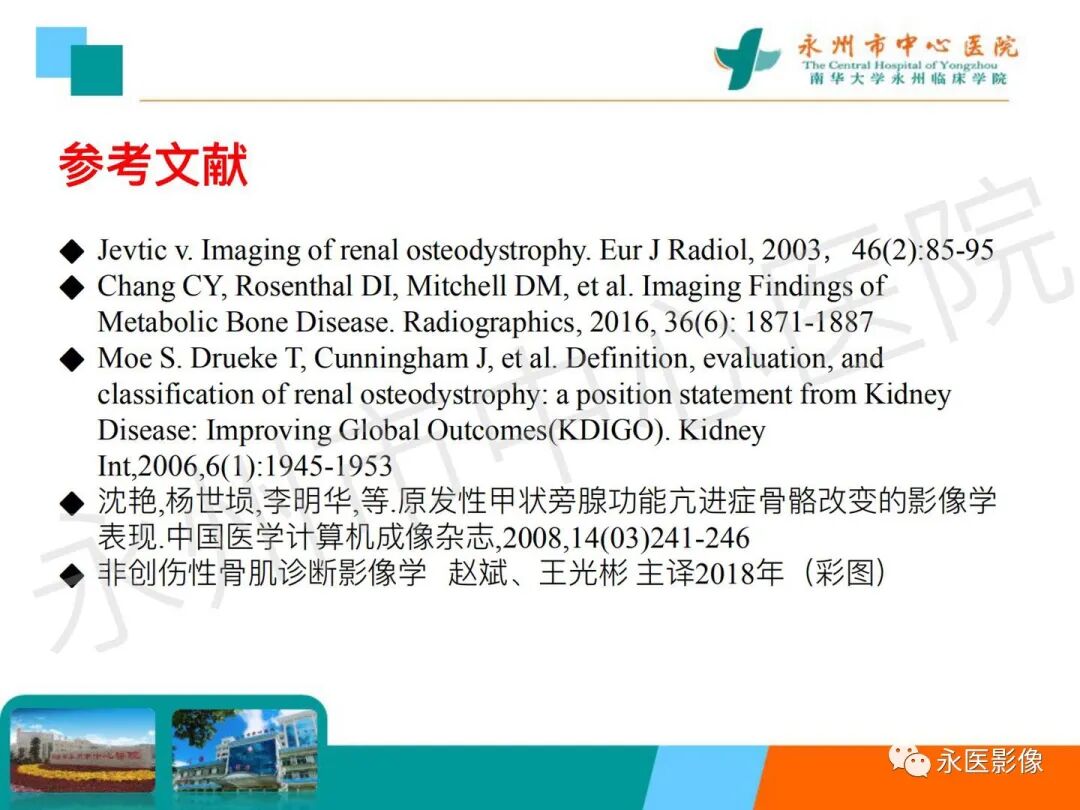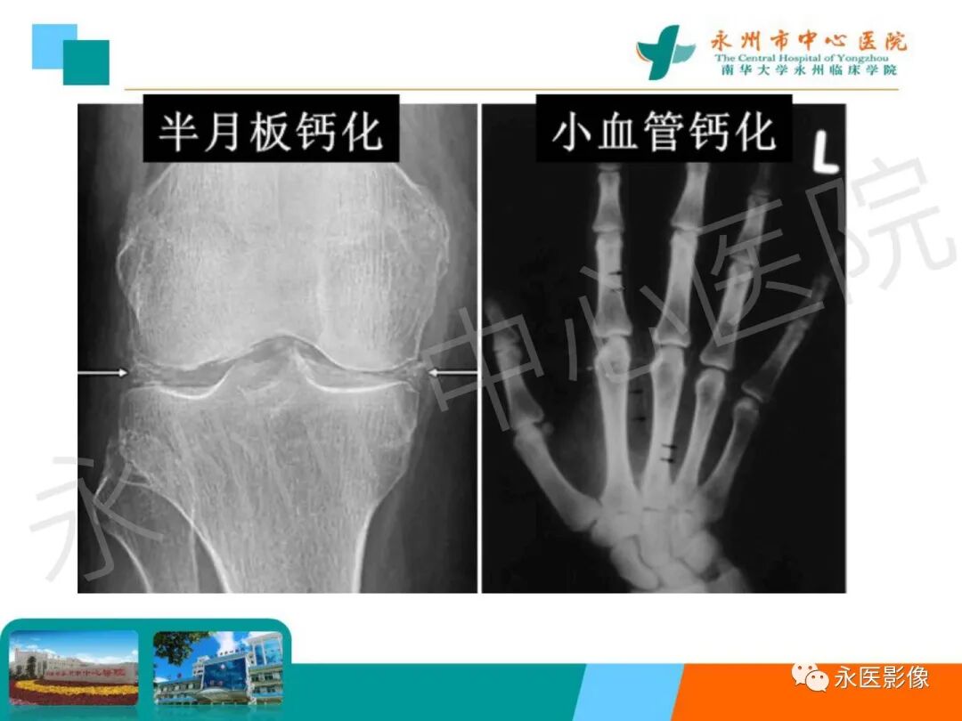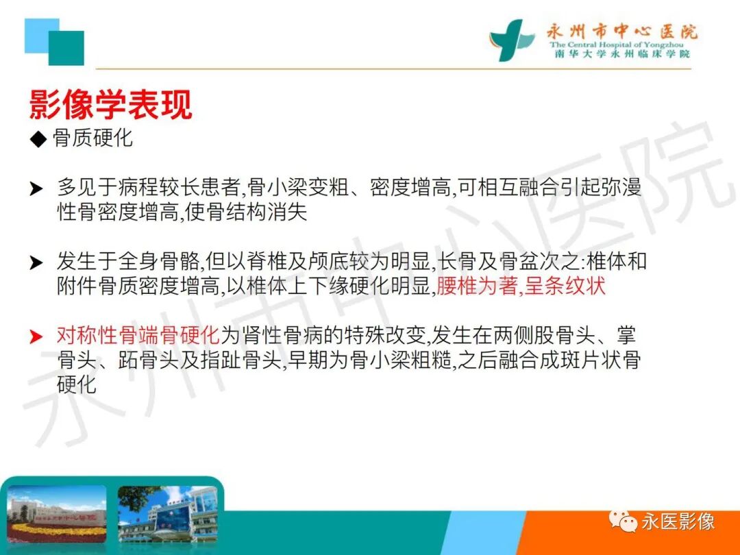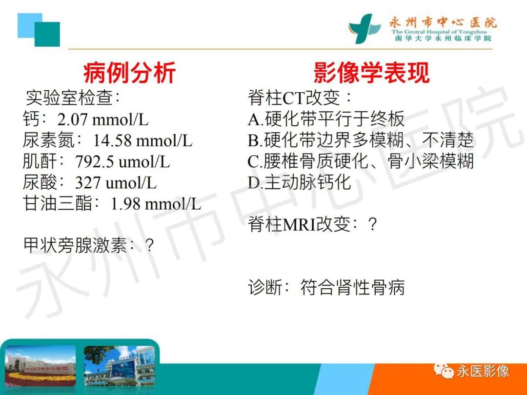 椎体夹心饼征:在X线平片上,胸腰椎椎体上、下缘终板各形成一条硬化带,每个椎体中心可见一条透明带,相互并行的硬化带和透明带与英式橄榄球衫(rugby sweater)上的条纹类似,西方学者称之为橄榄球衫椎体(rugger jersey spine)。这种两条硬化带中夹一条透明带的表现与中国的夹心饼亦相似,国内学者称之为夹心饼征。椎体终板上下缘的硬化带代表过多的骨样物质沉积,虽然它们的骨化并不充分,但这些骨样组织与正常椎体相比密度增加,在Ⅹ线照片上显示为不透光性,常为慢性肾衰竭所致