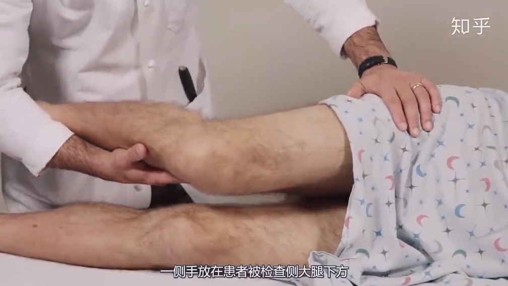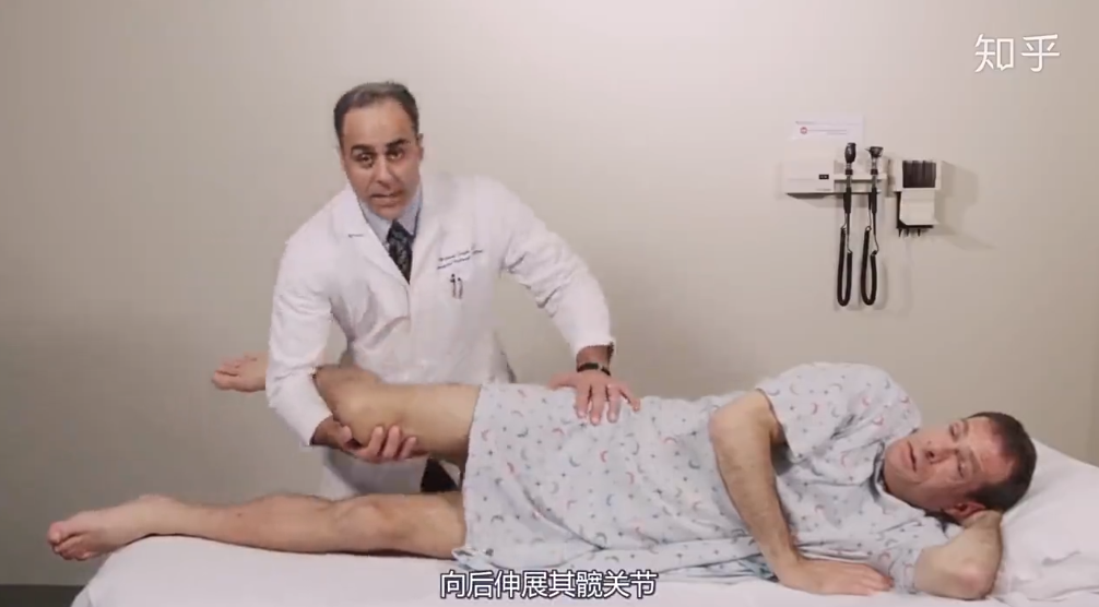 - 治疗师伸展患者的腿部并稍外展膝关节。