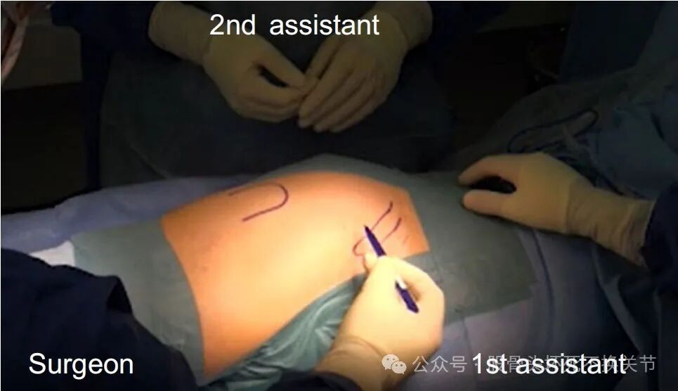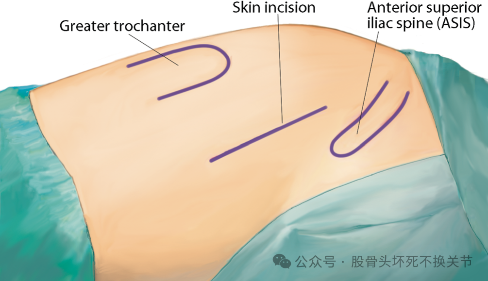 自髂前上棘(ASIS)外、远2~3cm处,向髌骨外缘做直切口,长度因人而异。