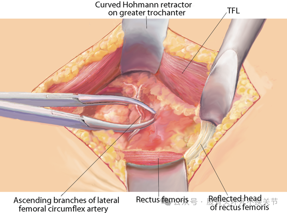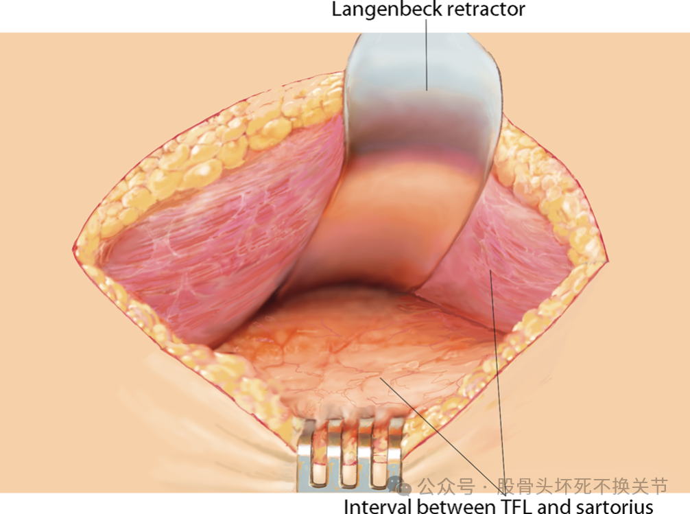 通过缝匠肌和股直肌(股神经支配)与阔筋膜张肌和臀中肌(臀上神经支配)之间的肌肉/神经间隙暴露至髋关节前方。髋关节外侧结构特别是大转子(GT)和髋关节外展肌的完整性得到保留。改进直接前入路技术,目的是方便髋和股骨假体的安全植入。