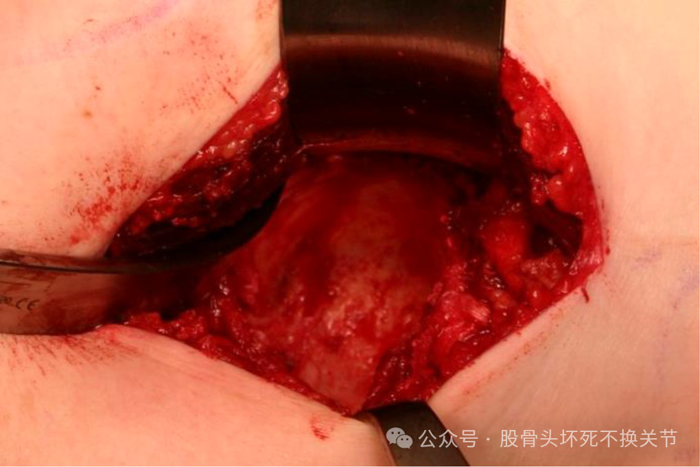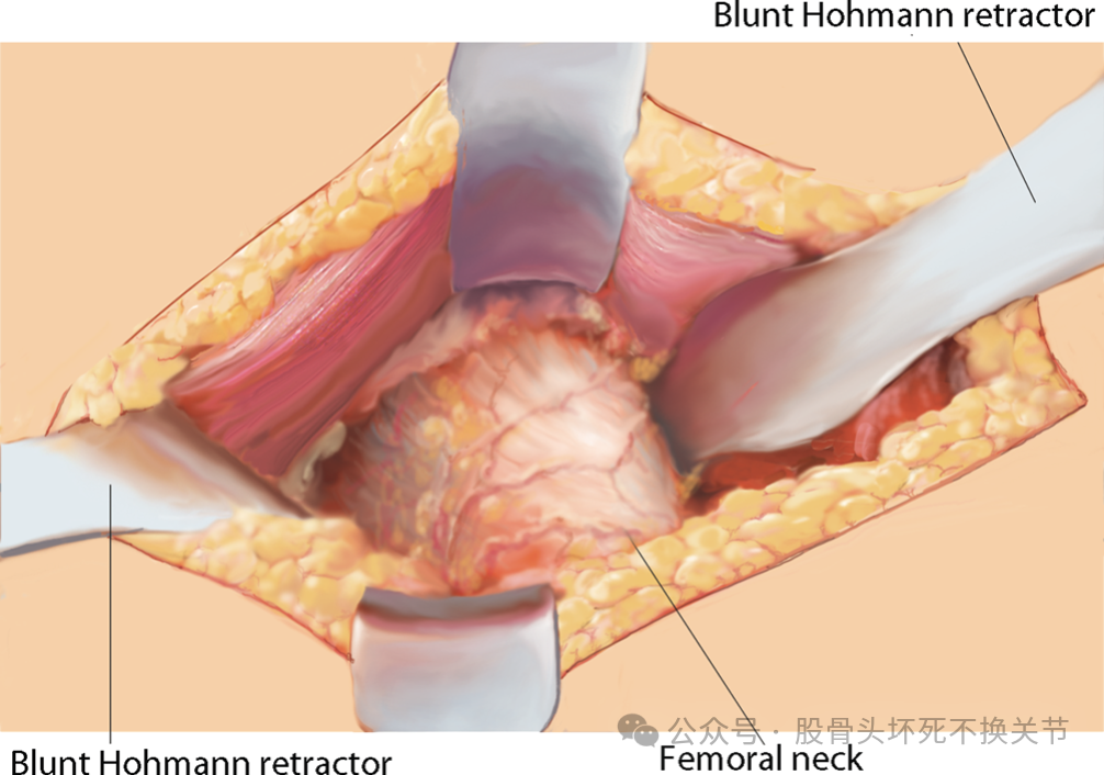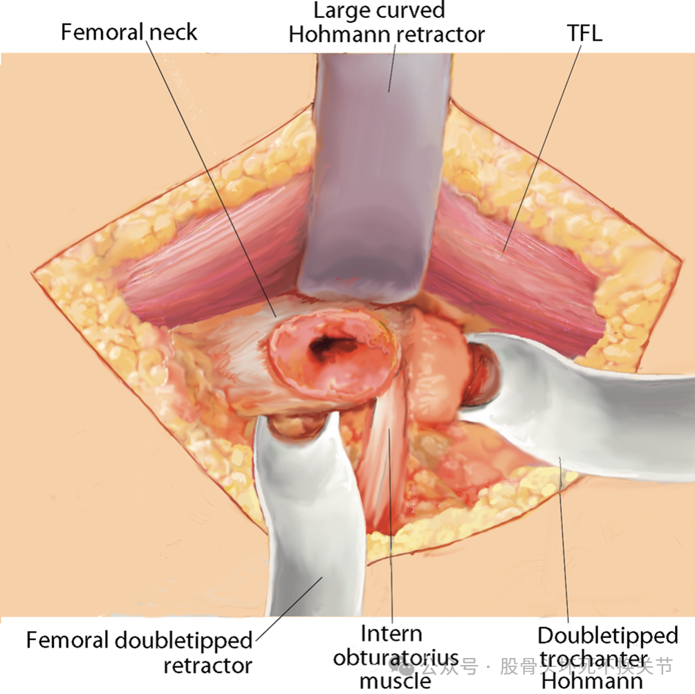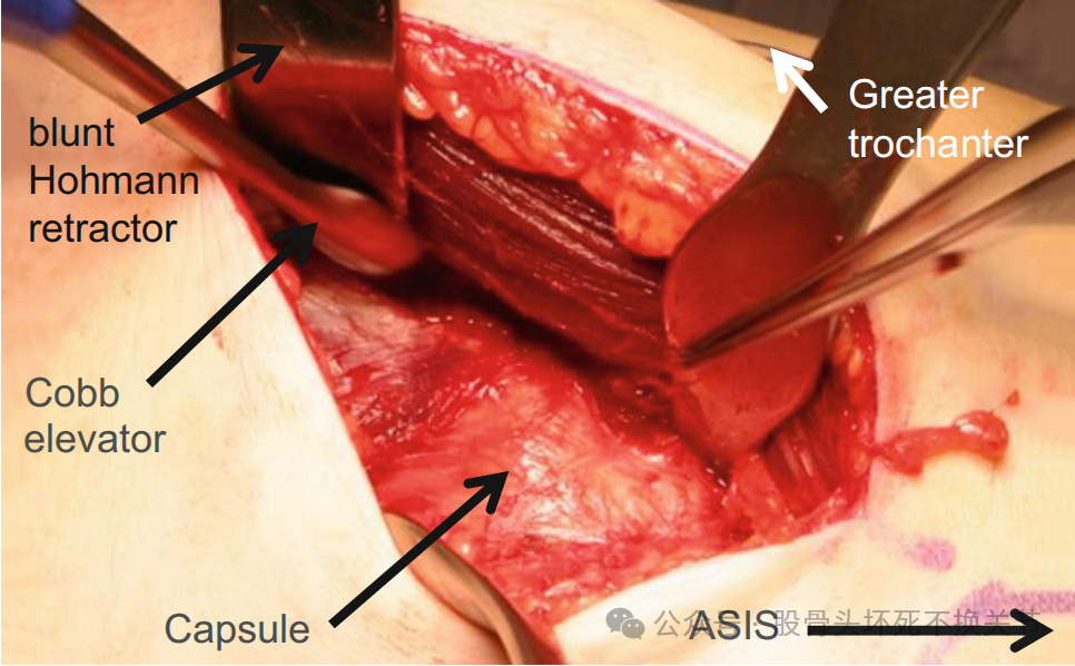 从外向内锐性分离髂囊肌与关节囊,并向近端和远端延伸,直到清晰显露关节囊的内下方。一把钝Hohmann骨撬放在关节囊内下方,一把放在外上方,完整显露关节囊,在大转子上再放一把拉钩,充分切除关节囊表面的纤维脂肪组织。