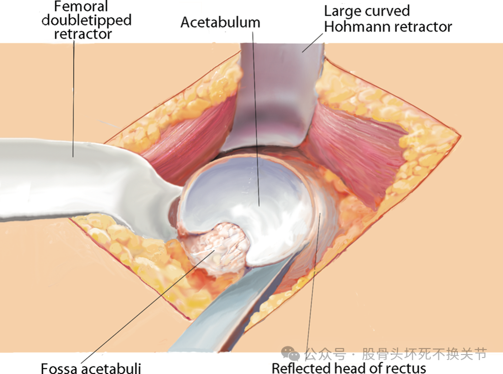 为了暴露髋臼,一把大弧度骨撬(右)放置在髋臼后缘,眼镜蛇双尖骨撬(左)放置在髋臼后壁下缘,一把窄的Hohmann骨撬放置在髂前下棘(AIIS)的前端边缘,牵开紧张的关节囊,并保护下面的髂腰肌腱。