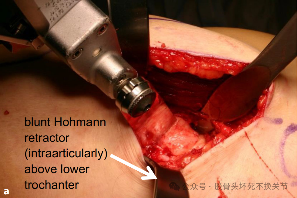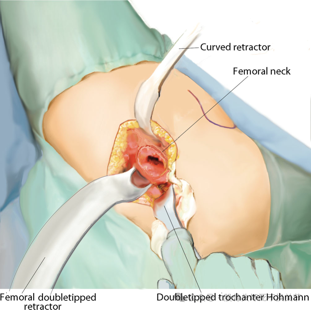 弯骨撬放置在大转子(GT)上便于暴露股骨近端。下肢外旋,以便双齿骨撬能够放在股骨矩区域。将股骨向前提拉,另一把双齿骨撬放在大转子外上方。