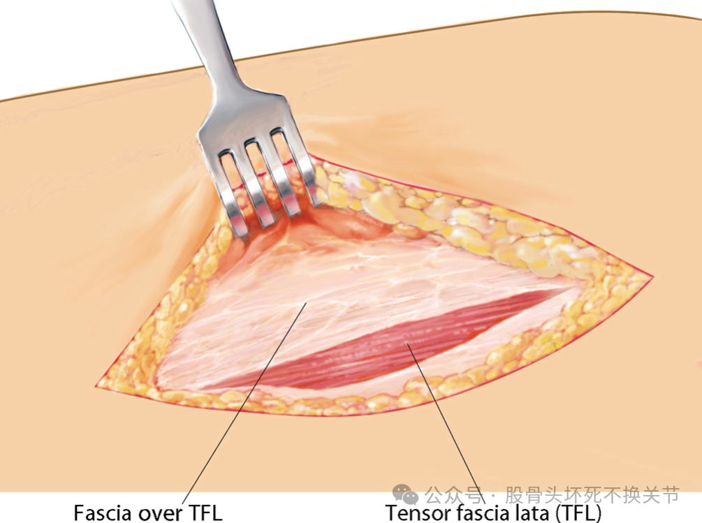 切开皮下组织,显露阔筋膜张肌(TFL)表面的筋膜,筋膜切口位于肌腹正中,向外牵拉阔筋膜张肌进入深层。