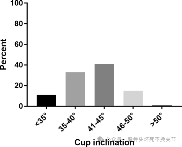 - 87.7%的病例臼杯外展角在35~50°之间;
