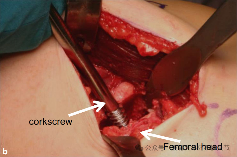 股骨头用“勺形”骨撬插入股骨颈外后方,取头器取出股骨头(b)。