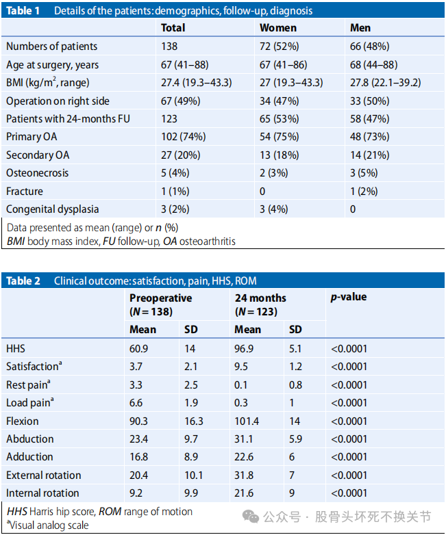作者建议在植入股骨假体试模后需要在各个角度屈伸旋转,评估软组织的张力、偏心距和关节稳定性,最后再植入假体。对手术区进行灌洗后关闭刀口,不常规使用引流管。该组病人信息:
