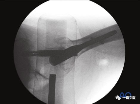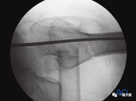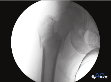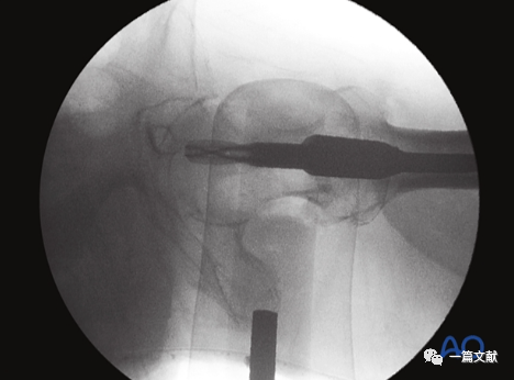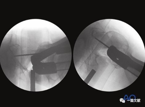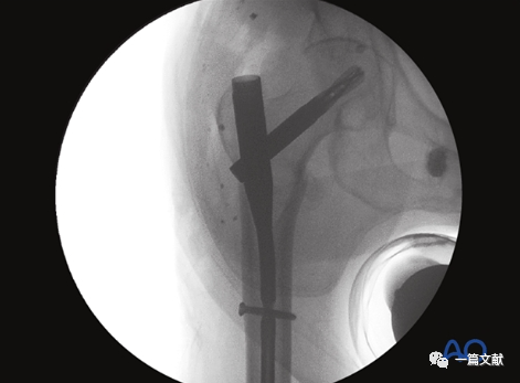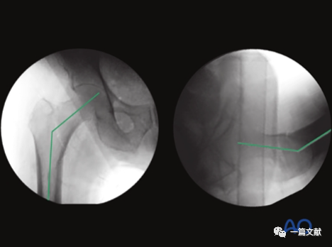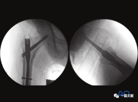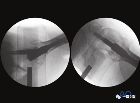 下图左侧正位片与右侧的轴位片,显示了内固定的良好位置(位于头颈中心与髓腔中心)。需要注意的是这些标准的术中透视图像,只有在良好骨折复位的基础上才能获得。