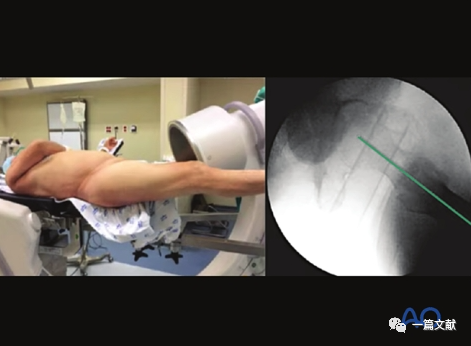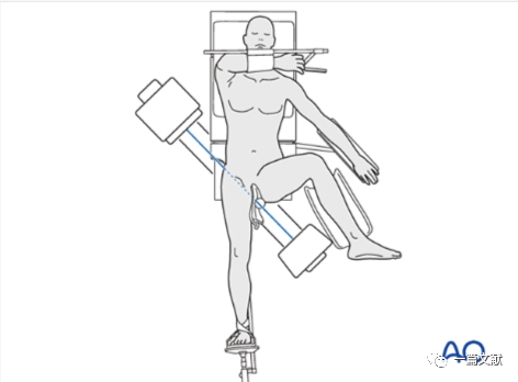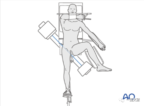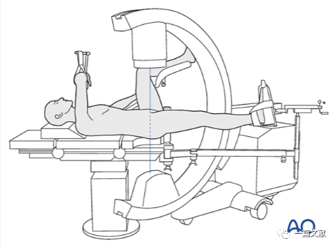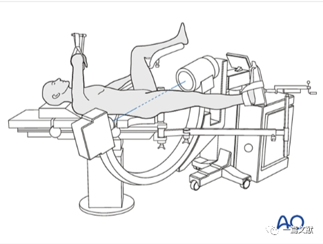 患者牵引床常规仰卧位,患肢牵引下稍内旋,髌骨朝上,健侧肢体外展屈曲固定。透视射线垂直患肢,如下图: