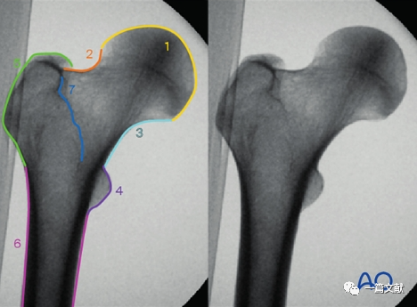 正位片图像解剖标记识别1,股骨头;2,股骨颈;3,内侧缘;4,小转子;5,大转子;6,股骨干;7,转子间线。