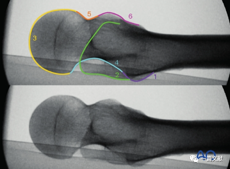轴位片图像解剖标记识别:1,小转子;2,大转子;3,股骨头;4,后缘线;5,前缘线;6,转子间线