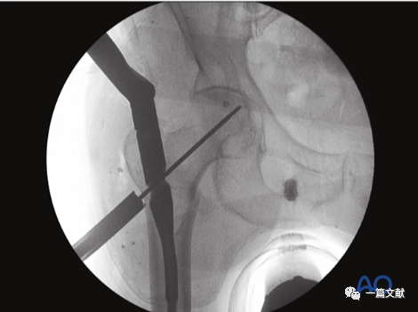 轴位片的作用:判断复位质量;观察头颈骨块与股骨干对线情况;确定导针准确的置入点。如下图: