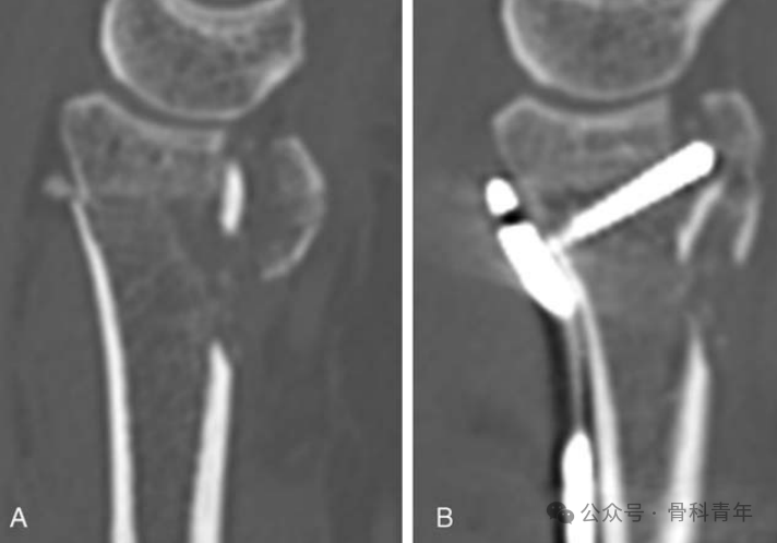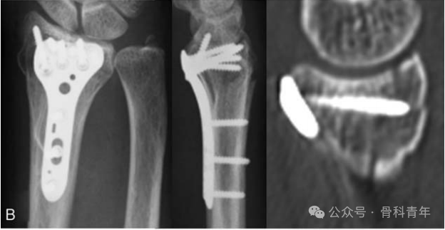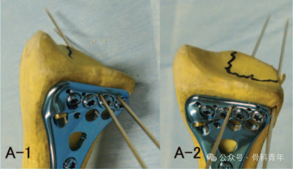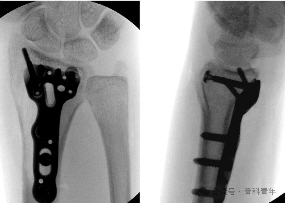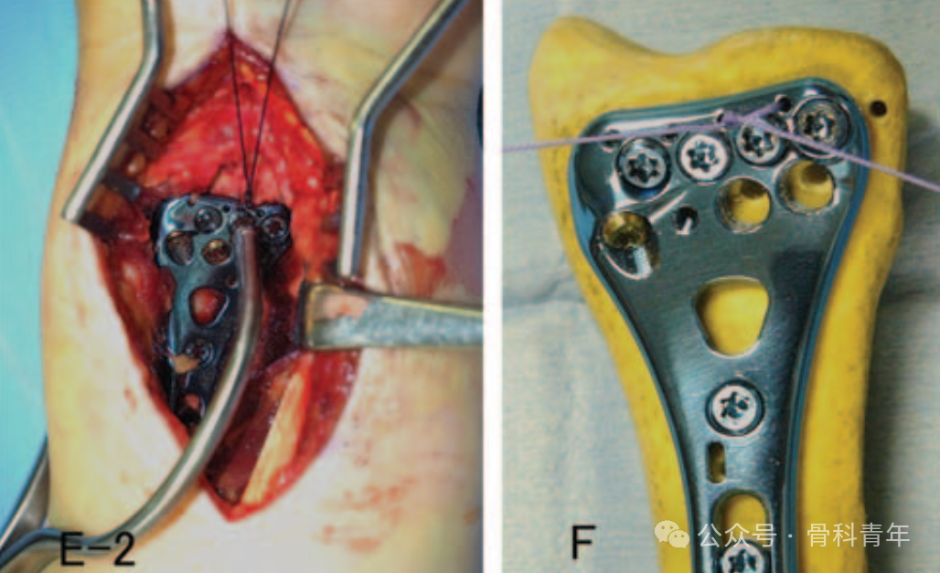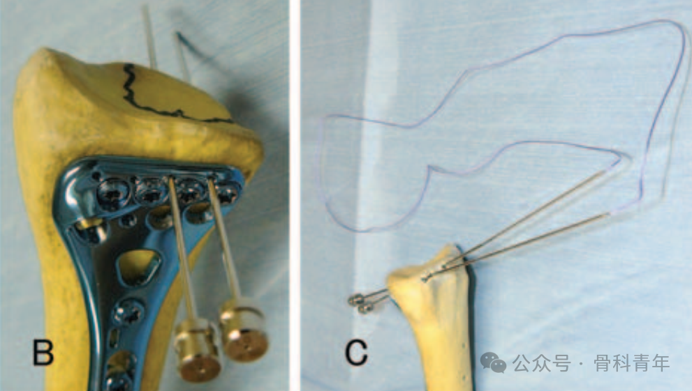 该方法的优势在于避免了背侧置入内植物,降低了手术创伤及避免肌腱激惹并发症;但该技术需要特殊的引线设备,以及在克氏针固定背侧骨块时可能具有一定的技术难度。可供临床医生参考。