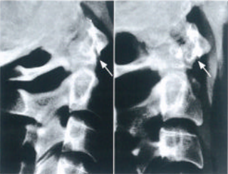 图10 寰枢关节前方不稳定:颈部后伸时衰椎复位,而颈部屈曲时,寰椎向前移位,寰齿间隙增大