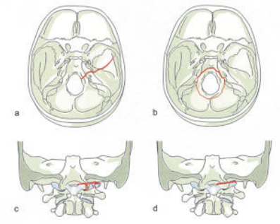 - Ⅰ型(图1a)该型骨折实际上是颅底骨折,骨折线由顶骨经一侧枕骨髁止于枕骨大孔,该型骨折属于稳定骨折。