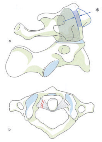 图11 a.正常寰齿间隙 (星号)成年人为3.5mm,儿童为5mm;b.如果寰齿间隙增大,则横韧带断裂或者撕脱骨折