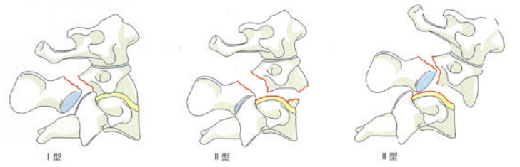 Ⅰ型稳定,不合并脱位。C2/3椎间隙是完整的,C2/3关节是稳定的。该型骨折占创伤性枢椎滑脱的65%。Ⅱ型椎体前脱位,C2/3椎间隙破坏,C2/3关节不稳定。该型骨折占创伤性枢椎滑脱的28%。Ⅲ型Ⅱ型骨折的基础上合并一侧C2/3小关节脱位。