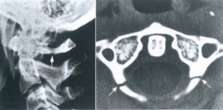 - Ⅲ型:后脱位,极为罕见。1978年Elimont和Bohlman报到了1例后方脱位合并寰椎后弓骨折图。