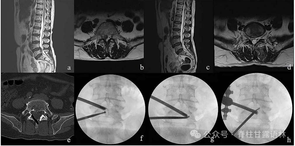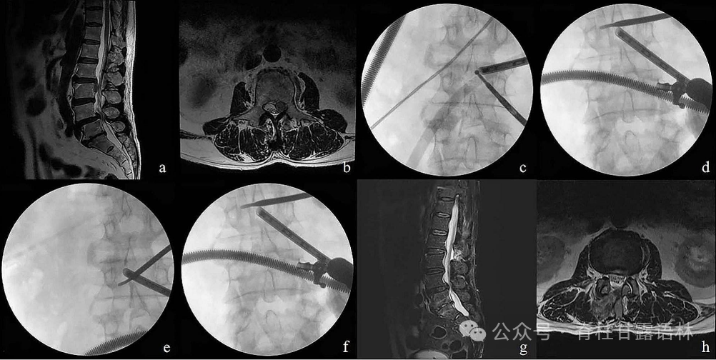 典型病例 L4/5椎间盘右侧脱垂。术前矢状面(a)和轴向面(b) t2磁共振成像显示L4/5椎间盘右侧向下脱垂。术后矢状面(c)和轴向面(d) MR显示椎间盘完全切除无残留。术后CT可见手术入路痕迹,同时未破坏关节突关节(e)。x射线显示理想的初始入路位置(f)。术中透视图像证实操作工具已到达对侧椎弓根下(g)和椎弓根上(h)的充分减压位置。