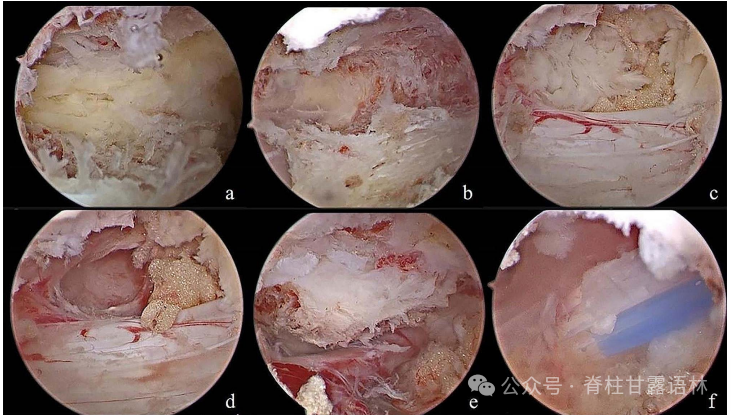 术中右入路内镜图像。(a)术中右入路内窥镜图像。磨钻减压椎板下缘和棘突根部后首先确定黄韧带中心裂隙。(b)采用过顶技术,椎板下减压范围到达对侧。(c)暴露的对侧脱垂髓核组织。(d)使用工具牵开对侧走形神经根,髓核钳摘除脱垂髓核。(e)对侧走形神经根的腋下和肩部均获得减压。(f)术后伤口内放置了蓝色的引流管。