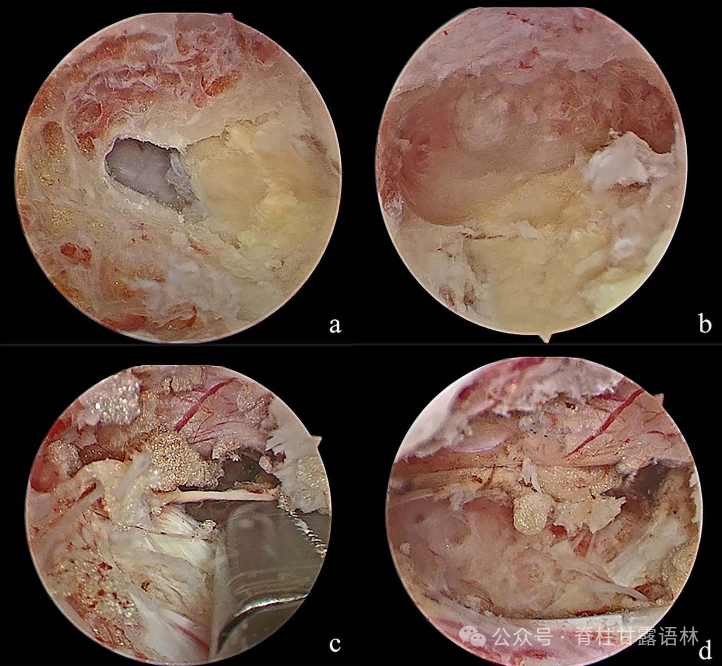 术中内镜图像。(a)术中右入路内窥镜图像,首先确定黄韧带的中心裂缝(b),这里代表了椎管中心线,越过此天然黄韧带裂隙即代表了已到达椎管对侧。髓核钳摘除对侧脱垂的椎间盘髓核组织(c)。硬膜和神经根在手术后获得减压(d)。