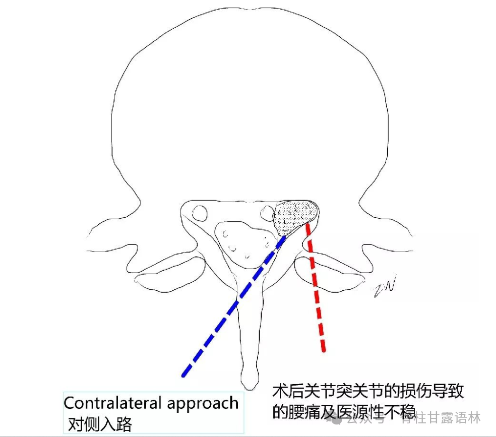 UBE治疗远端脱垂型腰椎间盘突出症的两种手术入路。红色虚线代表同侧入路,蓝色虚线代表对侧入路。(图片原创:公众号“医学手绘”,作者:张伟)内镜下选择突出侧入路的好处是手术距离病灶更近,术者更加熟悉解剖,但缺点时会破坏更多的关节突关节,导致术后腰椎疼痛和不稳,重度脱垂或多块髓核组织游离也可能视野所限,导致摘除不彻底而症状残留。对侧入路的优势在于具有更好的视野,不用过多破坏关节突关节,缺点是术者可能不熟悉相关镜下解剖和手术入路。近日,我国杭州中医院张伟团队发表研究[1],介绍了UBE经对侧椎板下入路治疗远端脱垂型腰椎间盘突出症的手术技巧和临床结果。
