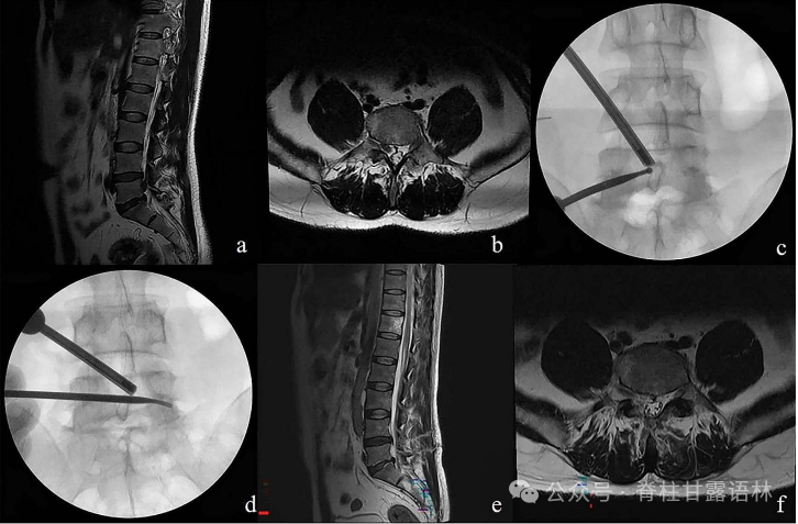 术前t2磁共振成像显示,矢状面(a)和轴向面(b)显示L4/5椎间盘在右侧向下脱垂。x射线显示UBE观察通道和操作通道理想的初始位置(c)。术中透视图像证实操作工具可到达的对侧减压范围(d)。术后矢状面(e)和轴向面(f)磁共振图像显示,脱垂的椎间盘无残留。