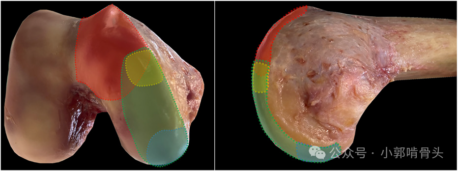 不同手术入路可显示的股骨内侧髁的关节面,红色区域:内侧髌旁入路;黄色区域:后内侧入路(前内侧支持带和内侧副韧带之间);蓝色区域:后内侧入路(后斜韧带和腓肠肌内侧肌腱之间);绿色区域:内侧髁截骨显示区域。