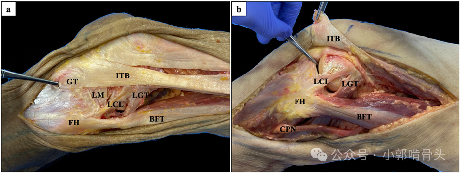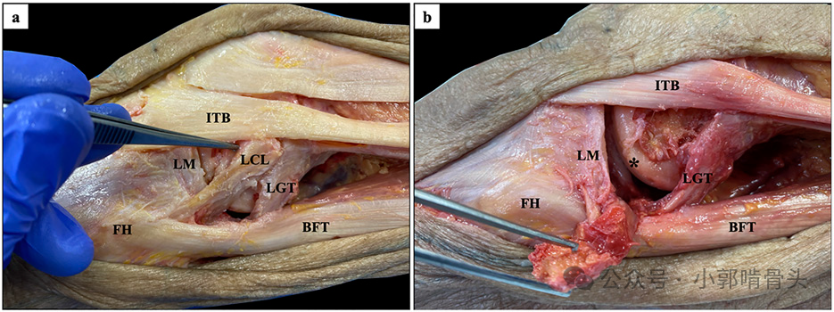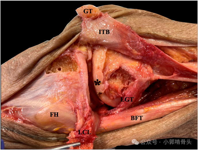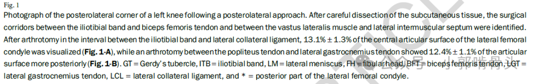 通过后外侧入路显露左膝后外侧角:通过髂胫束(ITB)和股二头肌(BFT)之间及股外侧肌及外侧肌间隔之间建立手术通路,(Fig. 1-A)髂胫束和外侧副韧带(LCL)之间切开关节囊可显露13.1% ± 1.3%的外侧髁中心关节面;(Fig. 1-B)在腘肌腱和腓肠肌外侧肌腱(LGT)之间切开关节囊可显露12.4%±1.1%的股骨外侧髁后方关节面。GT:gerdy结节,LM:外侧半月板,FH:腓骨头。