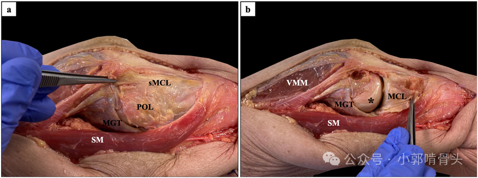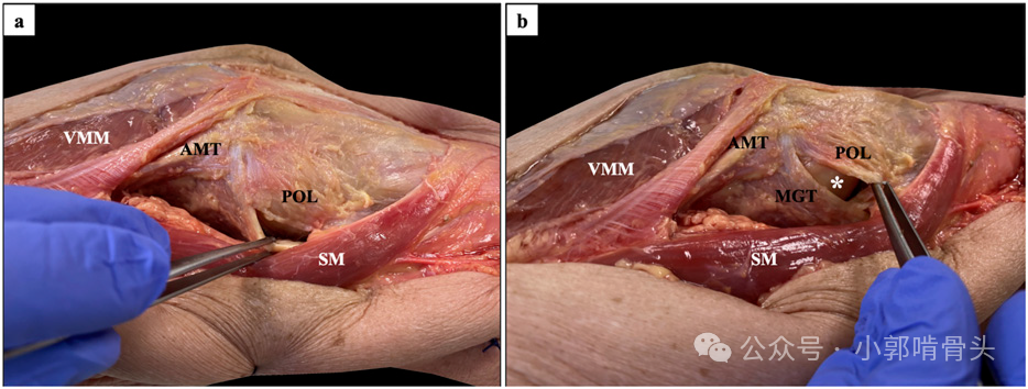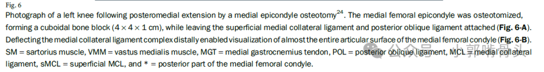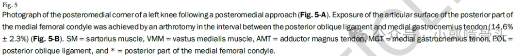 行后内侧入路,在后斜韧带(POL)和内侧腓肠肌腱(MGT)之间切开关节囊可显露(14.6%± 2.3%)股骨内侧髁后方关节面。SM:缝匠肌,VMM:股内侧肌,AMT:大收肌腱。