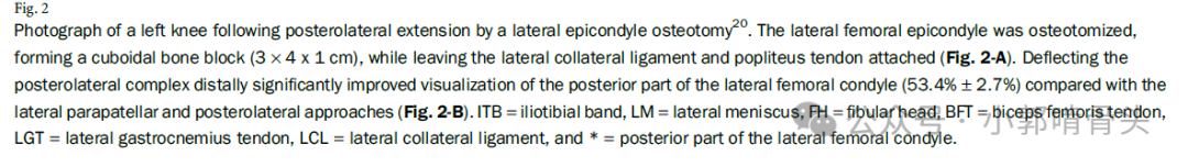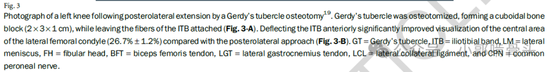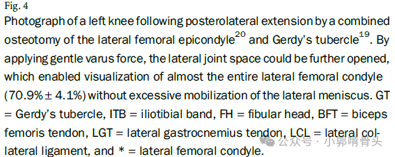 同时行Gerdy结节和股骨外侧髁截骨,同时轻柔施加内翻应力可显露大部分股骨外侧髁关节面(70.9% ± 4.1%),避免过度分离外侧半月板。