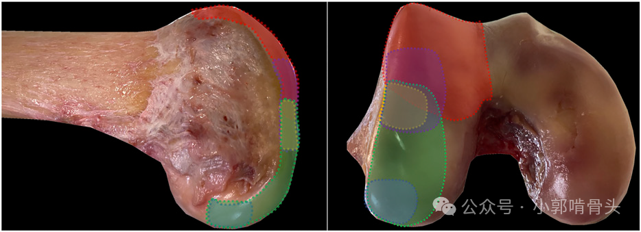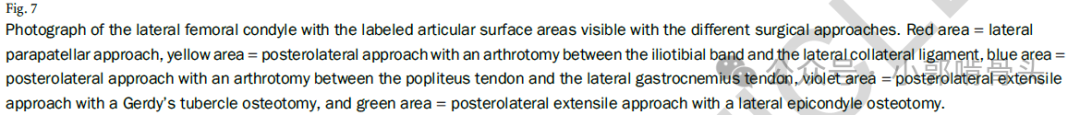 不同手术入路可显示的股骨外侧髁的关节面,红色区域:髌旁入路;黄色区域:后外侧入路(髂胫束和外侧副韧带之间);蓝色区域:后外侧入路(腘肌腱和腓肠肌外侧肌腱之间);紫色区域:Gerdy截骨显示区域;绿色区域:外侧髁截骨显示区域。