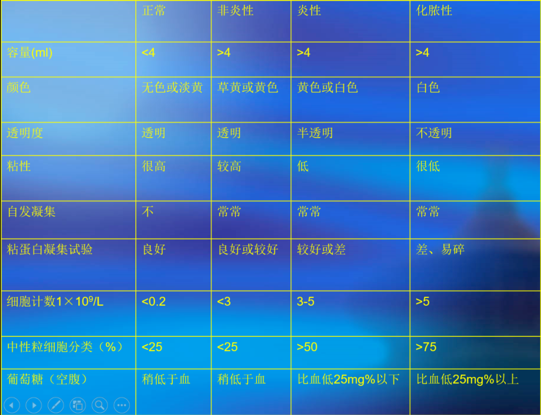 正常滑膜液呈淡黄色或无色,清晰透明,粘稠性高,但不能自行形成凝集块,粘蛋白凝集试验所形成的凝块良好,白细胞数<0.2×109/L,中性粒细胞<25%,葡萄糖含量(空腹)略低于血糖水平,细菌培养为阴性。