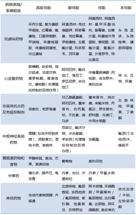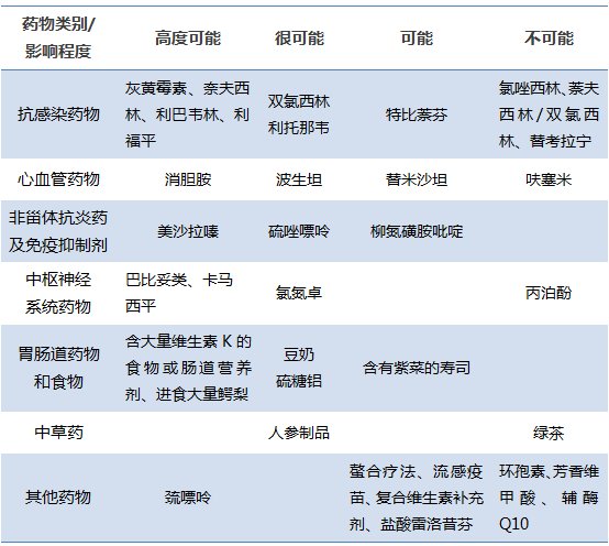 药物、饮食均可改变华法林的药代动力学。因此,服用华法林的患者在加用或停用任何药物包括中药时应加强监测INR。