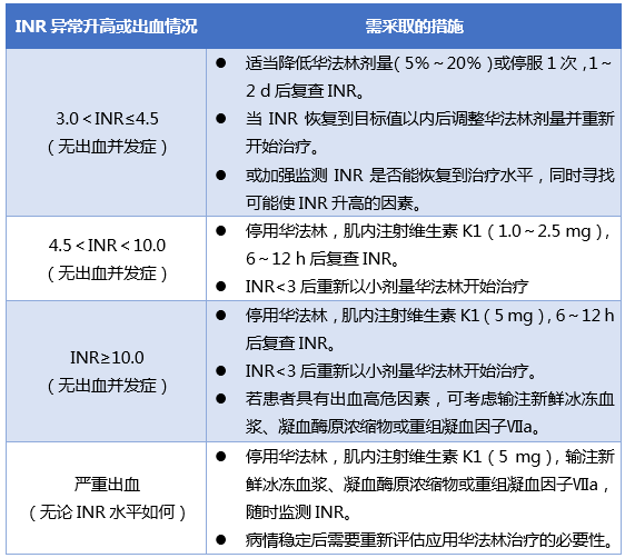 服用华法林出现轻微出血而INR在目标范围内时,不必立即停药或减量,应寻找原因并加强监测。患者若出现与华法林相关的严重出血,首先应该立即停药,输凝血酶原复合物迅速逆转抗凝,还需要静脉注射维生素k1 5~10 mg。