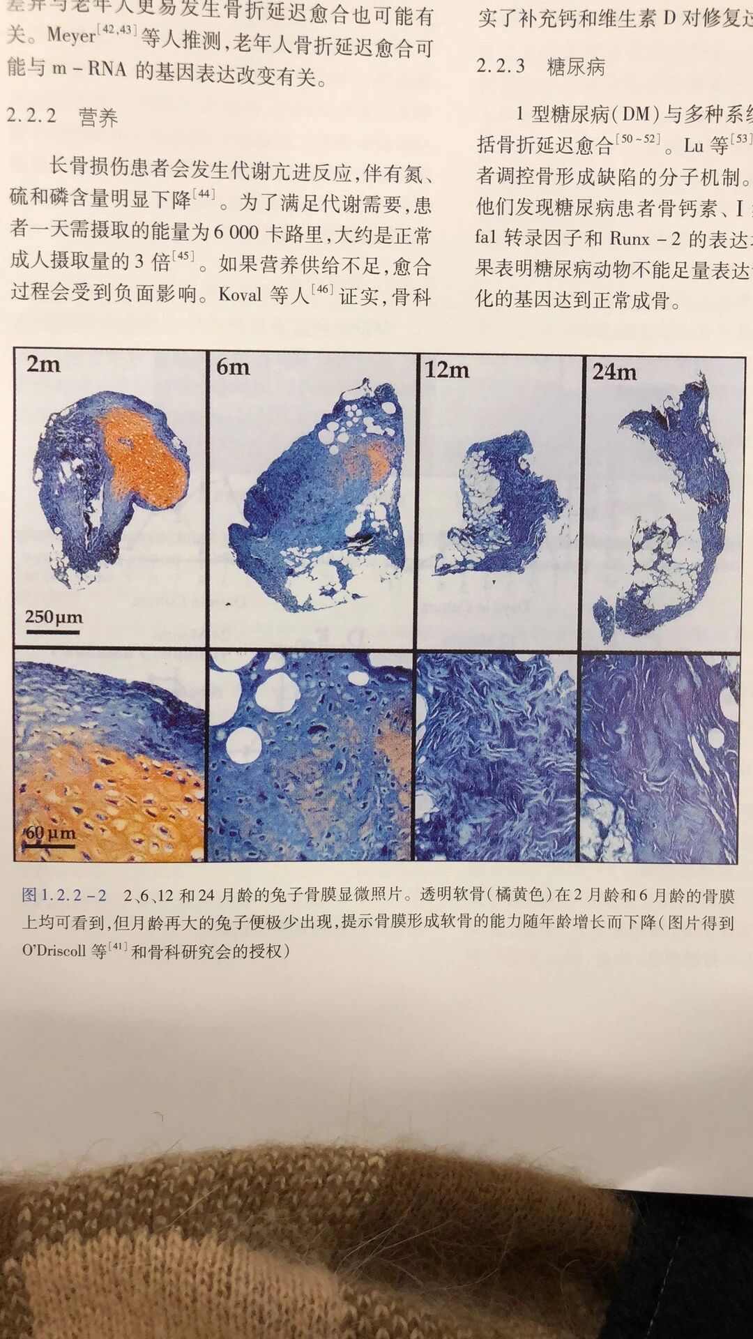 图2 6、12和24月龄的兔子骨膜显微照片。透明软骨(橘黄色)在2月龄和6月龄的骨膜上均可看到,但月龄再大的免子便极少出现,提示骨膜形成软骨的能力随年龄增长而下降(图片得到O'driscoll等)和骨科研究会的授权)
