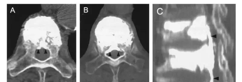 B经椎旁静脉渗漏:在椎体后缘相对对称分布。一般不超过椎管横径的1/3。矢状位CT显示会向头尾侧弥散。