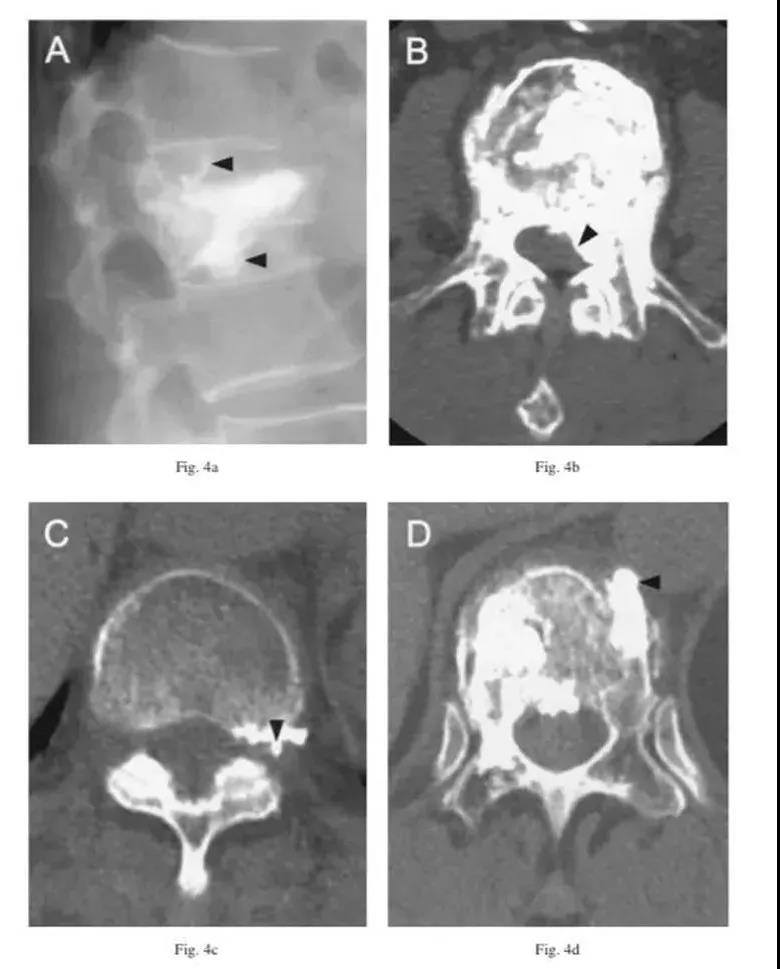 C经皮质缺损渗漏:顺着缺损区到处跑,椎体周围、椎管内、椎间盘,哪里有路往哪走。
