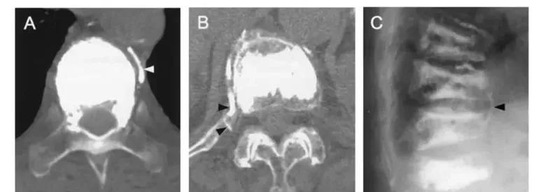 根据渗漏的途径及CT表现,将骨水泥渗漏分为三种类型:B经椎旁静脉渗漏;S经节段血管渗漏;C经皮质缺损渗漏。