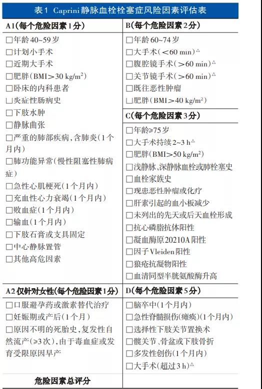 注:①每个危险因素的权重取决于引起血栓事件的可能性。如癌症 的评分是3分,卧床的评分是1分,前者比后者更易引起血栓;②△为 只能选择 1 个手术因素;③危险分级:低危为 0~1 分;中危为 2 分;高 危为3~4分;极高危≥5分