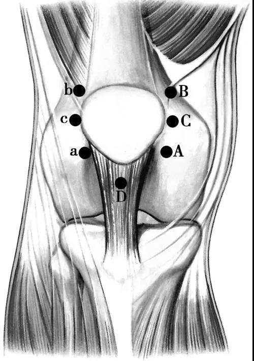 A.前内入路;B.髌内上入路;C.髌旁内侧入路;a.前外入路;b.髌外上入路;c.髌旁外侧入路;D.经髌腱入路