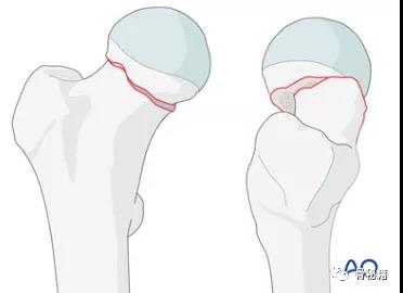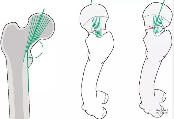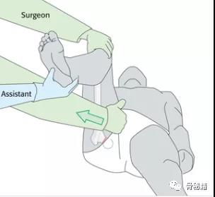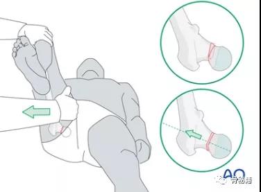同时外科医生的同侧手沿着股骨颈线拉动,