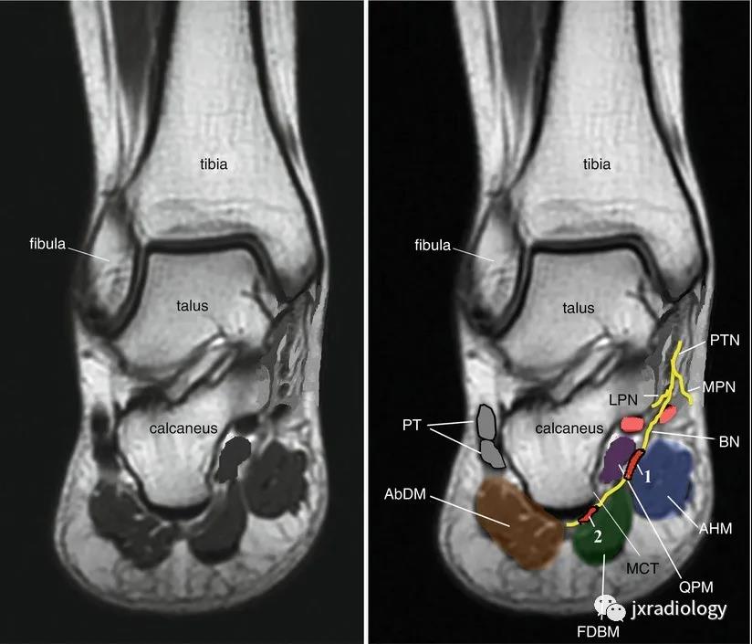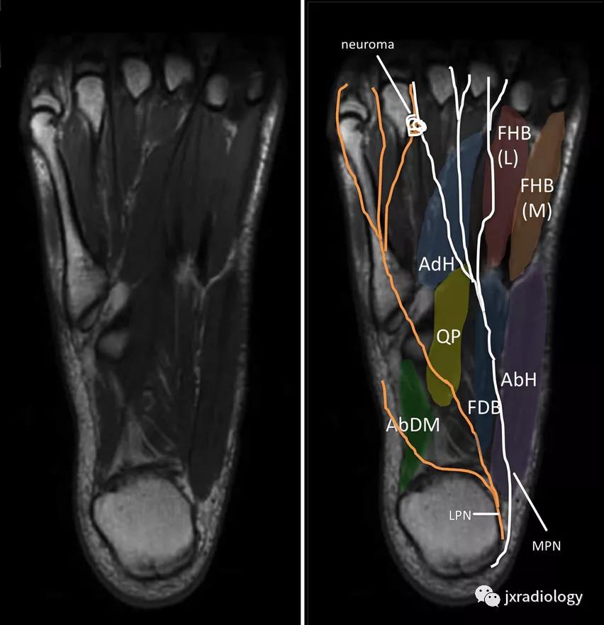 Baxter神经卡压是一项临床困难的诊断,在足跟痛的表现中常常被忽视。MRI可通过识别小趾展肌(AbDM)肌腹部异常来评估神经卡压的失神经作用。