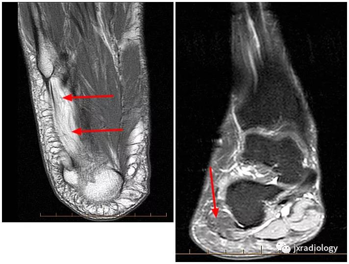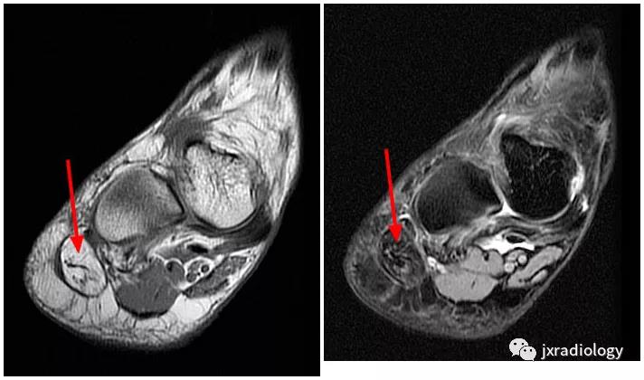 MRI已被证明是非常有价值的显示失神经支配的肌肉相关变化;与超声或CT相比,MRI对肌肉内的组织变化更为敏感;并且与肌电图相比具有优势,因为MRI检查的无创性,优越的解剖细节,能够显示具有双重神经支配的肌肉的病理学改变,并且能够排除其他诊断(骨折,肿瘤、筋膜炎)。正常小趾展肌在T1WI和液体敏感序列上显示等信号(下图红箭)。