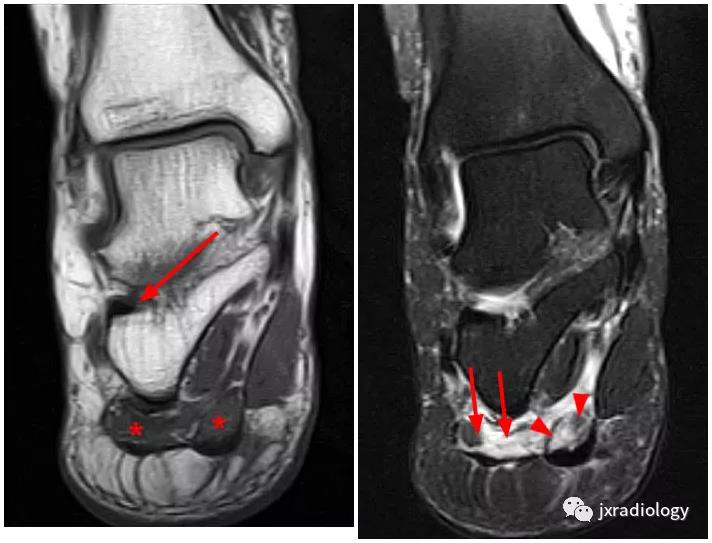 T1像肌肉呈等信号(星号),未见萎缩;抑制T2像可见小趾展肌(箭)和趾短屈肌(箭头)肌肉水肿。