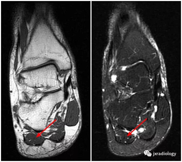 小趾展肌患有严重萎缩和脂肪浸润的患者冠状位的T1WI和抑制PDWI图像,由于慢性Baxter神经受累而选择性地累及小趾展肌;小趾展肌的信号强度(箭)类似于相邻的皮下脂肪,没有明显的肌肉水肿。