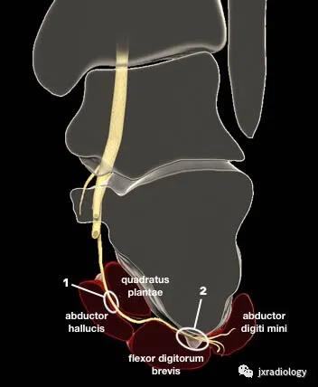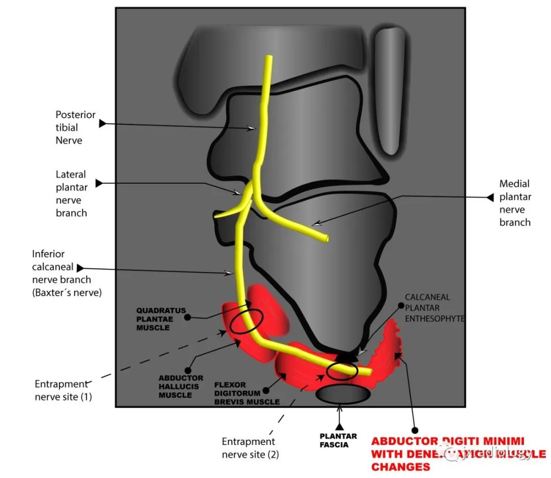 2、当更为远端神经沿着跟骨内侧粗隆的前部通过时,足底跟骨附着点和足底筋膜炎可能导致压迫。
