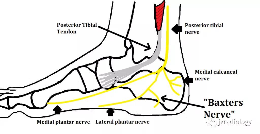 Baxter’s 神经(巴克斯特神经)为足底外侧神经第一分支,也称为跟骨下神经,支配小趾展肌(AbDM)。