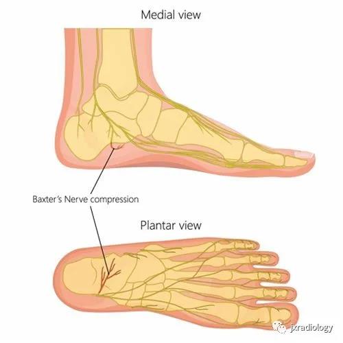 Baxter’s神经卡压可产生与足底筋膜炎难以区别的临床症状,虽然见于20%足跟痛的患者,但相对于足跟痛的其他原因常常被忽视。小趾展肌(AbDM)可能存在病变,但临床上很难检测到。MR可用于检测小趾展肌(AbDM)中与神经支配相关的肌肉变化,从而证实对Baxter’s神经卡压的诊断。